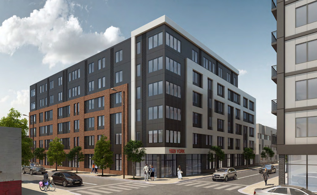 Continuing north, we come to 1817 E. York St., where yet a large project has recently wrapped up. Once again artists studios are included in this project (thanks, IRMX zoning!), which will include 106 units along with 33 parking spaces. This one – now called The Mill at York Station – looks like it’s completed, and while the massing is identical to the plans, this got a modern, cooler color palette in place of the previously proposed faux-wood panels.