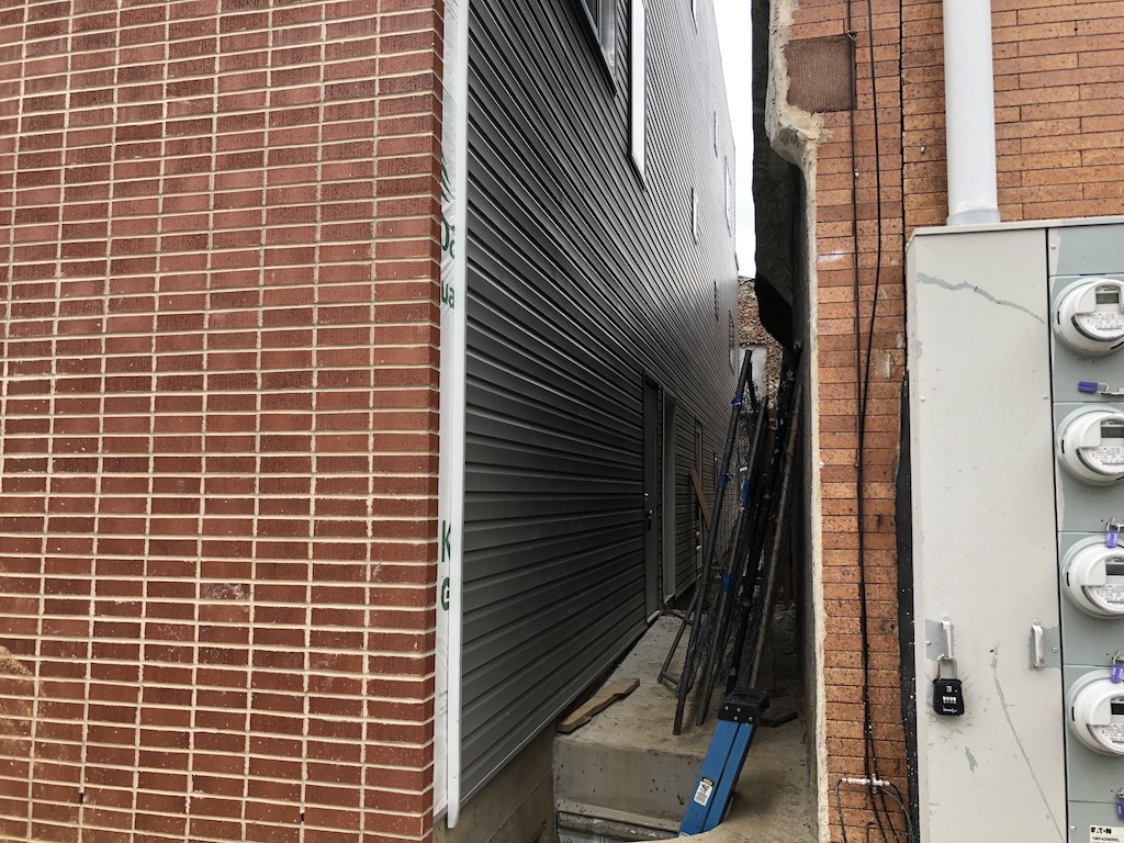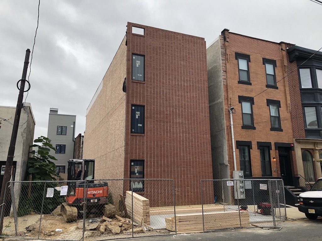 This building is unlike any we’ve seen in all our years covering new construction in Philadelphia. There’s no front door. There are only three windows on the front of the building and they’re all pushed to one side. The bricks are in a stack bond pattern, while the vast majority of brick facades in Philadelphia are stacked in an offset pattern. Needless to say, it catches the eye as you pass by the project.
