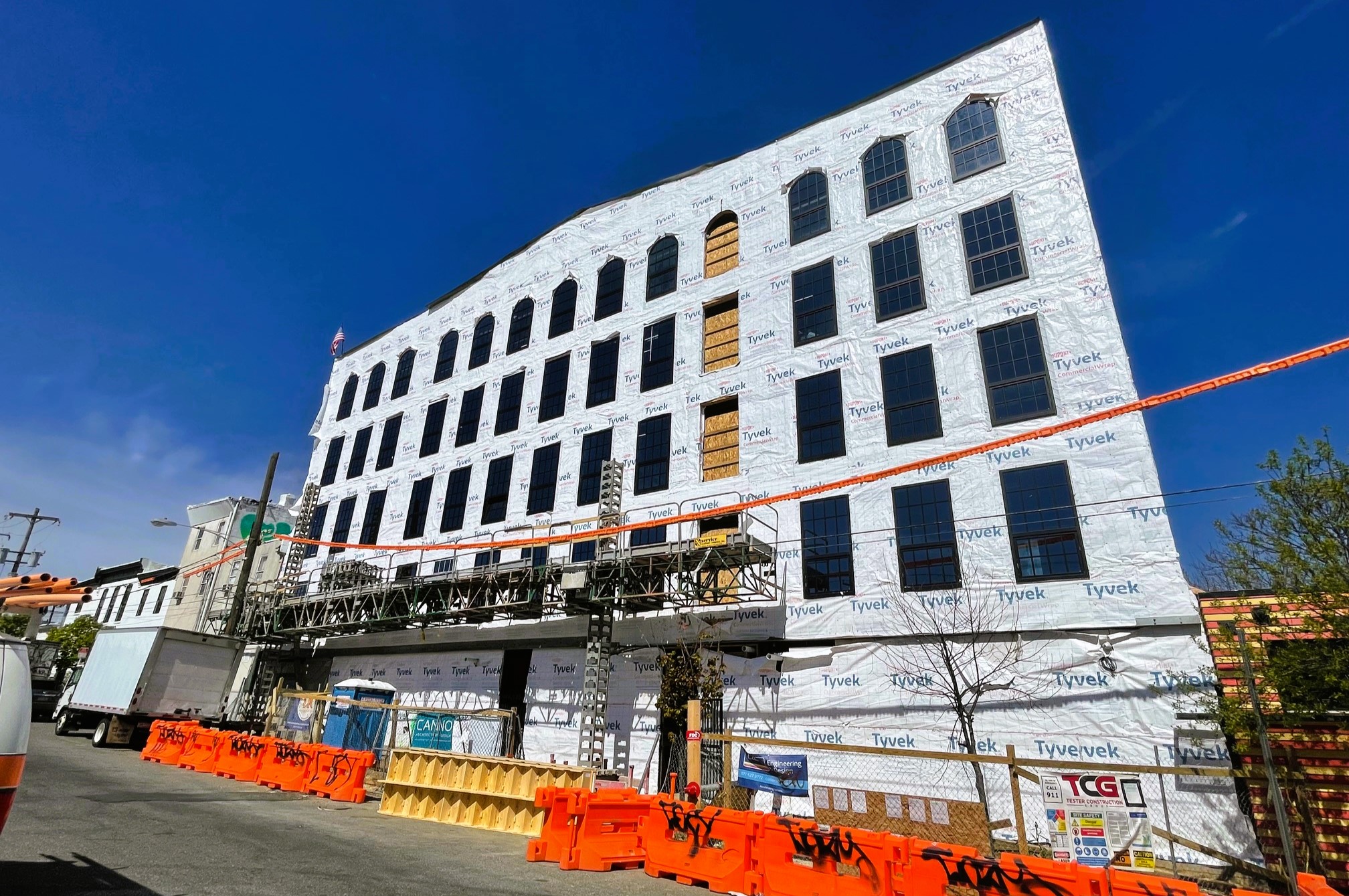 After a visit last spring found the former parking lot getting started with construction, we were pleased to see the major progress on this 41-unit apartment building called the Coral House. Developed by Archive Development, the plan here calls for those units to rise over “non-residential” space, presumably for a commercial or retail tenant. This project calls for zero car parking with space for 13 bicycles also part of the plans. A green roof bonus allows for some additional height for this building from Canno Design. While the white brick and details are not yet up, the white wrap and windows give us a pretty decent idea of what the final product will look like.