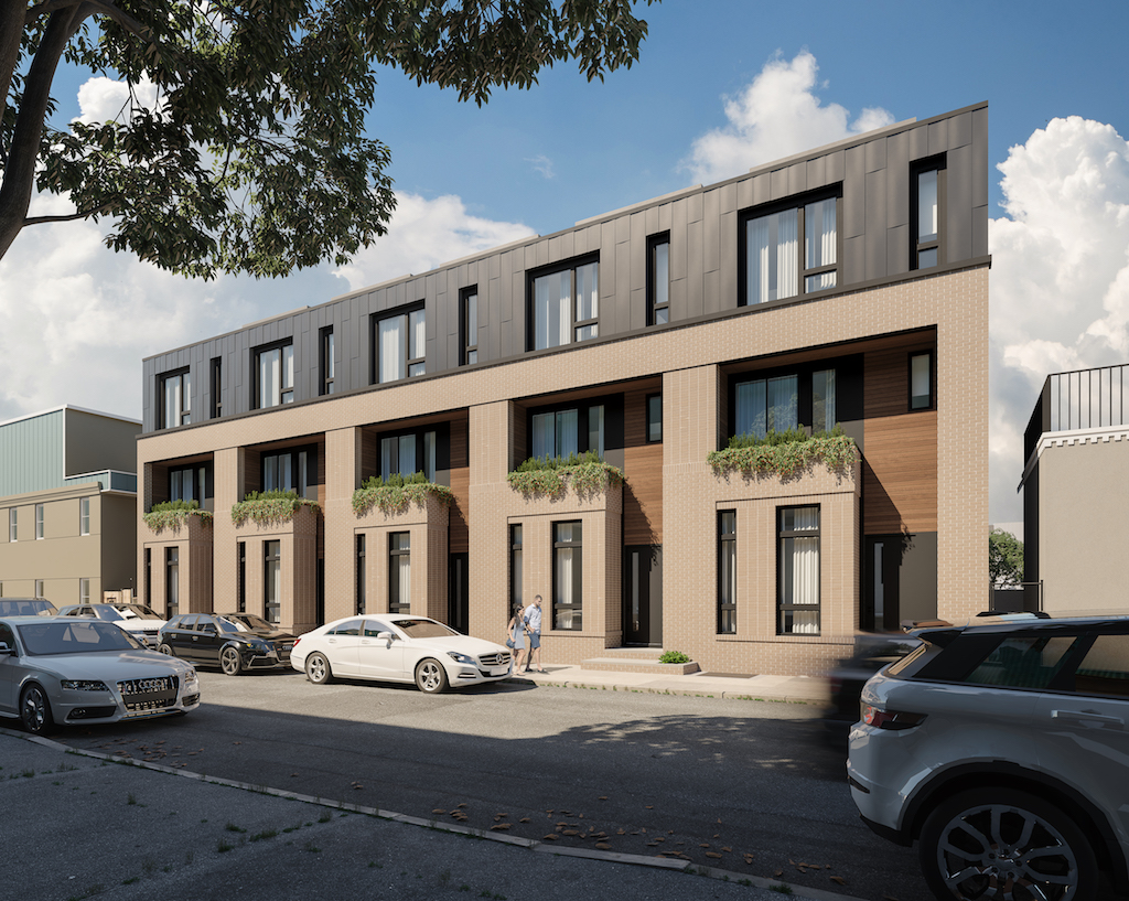 As we’ve seen with several other former industrial sites in this part of town, we’ll be getting a townhome project at this location. The developers are calling the project the Cumberland Nine and are, as you might guess, planning nine homes here. The plans call for three extra-wide homes on E. Cumberland St., each with two car parking, and a carriage house style home as well, which will float over the access point to the project’s drive aisle. On Letterly Street, there will be five homes, and all of those homes will have one-car parking. Gnome Architects did the design work and they were kind enough to share some renderings of what we can expect here.