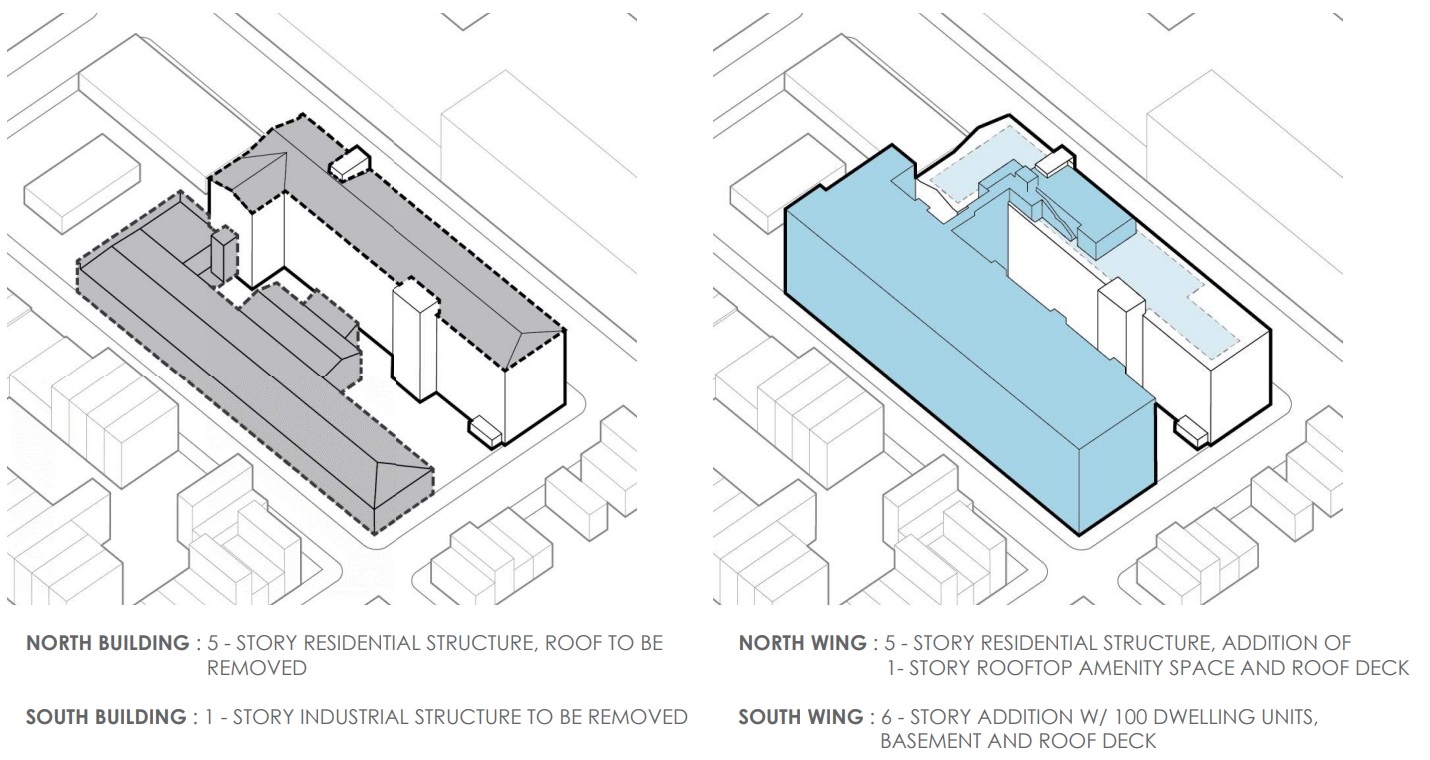 However, new owners Chatham Bay are moving forward with plans that appear to keep some of the industrial/artisanal vibe of the area. 100 new units with ground floor industrial will rise on the former Urban Axes site, with 72 units and ground floor industrial/studio space remaining in the five-story building. These two structures will be connected, forming one large project with a total of 172 units.