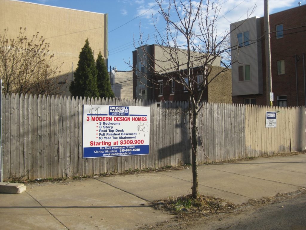 On the other side of 2231 Coral St. are four vacant lots owned by City agencies. Last year, the lots went up for bid from the Redevelopment Authority. We know because we bid on them. Unsuccessfully. We believe that the same folks building the home now also won the bid for the City lots. The sign suggests they'll be building three homes on the four lots, with each home having three bedrooms, three bathrooms, and starting at just under $310K. If we're correct in our assumption the three homes will each be 16' wide, making them far roomier than the neighboring homes. We wonder, why didn't the developers simply wait a few more months and build four 15' wide homes on five lots, which would have ostensibly gotten them a higher price for the home that's currently under construction.