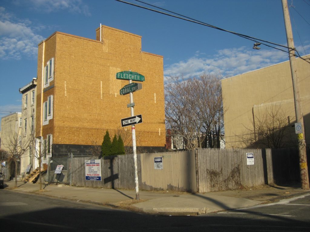 Increasingly these days, we're seeing vacant lots get filled in East Kensington. As lots have become more scarce on Amber Street, we're seeing more action on Coral Street. In a couple of years, we would bet that building will pick up on Emerald Street. And so on. Today, we look at the corner of Coral & Fletcher, just up the block from the fascinating Vader House. There, we find a new home rising with plans for some more in the works.