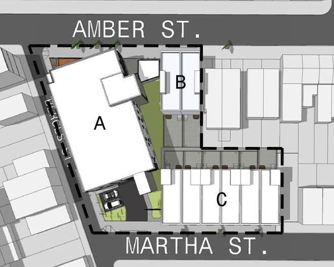 As we told you before, the project will mean the conversion of the building in the photo above into a combination restaurant/parking space and it will also mean the addition of three stories above with twelve apartment units. Two homes are coming on Amber Street and six more will rise on Martha Street. And we're digging the renderings, especially the new addition to the existing building.