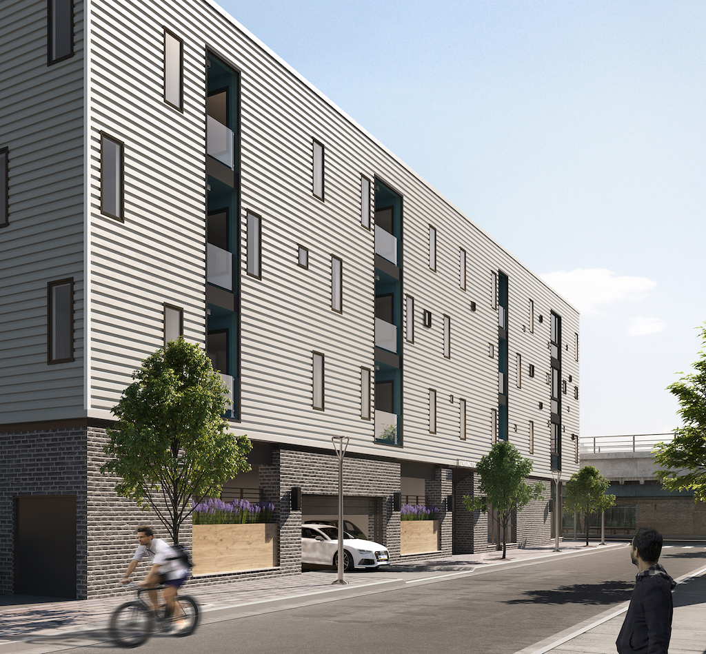 What you see in the photo above are the stair/elevator towers for what will eventually be a four story building with 28 apartments, retail on the first floor, and 10 parking spots. Obviously, the construction is still in the very early stages, so it’s impossible to know what the finished product will look like. Well, it’s impossible if you don’t have project renderings. And wouldn’t you know it, thanks to the good people at KJO Architecture, we just so happen to have some renderings to share. Check ’em out: