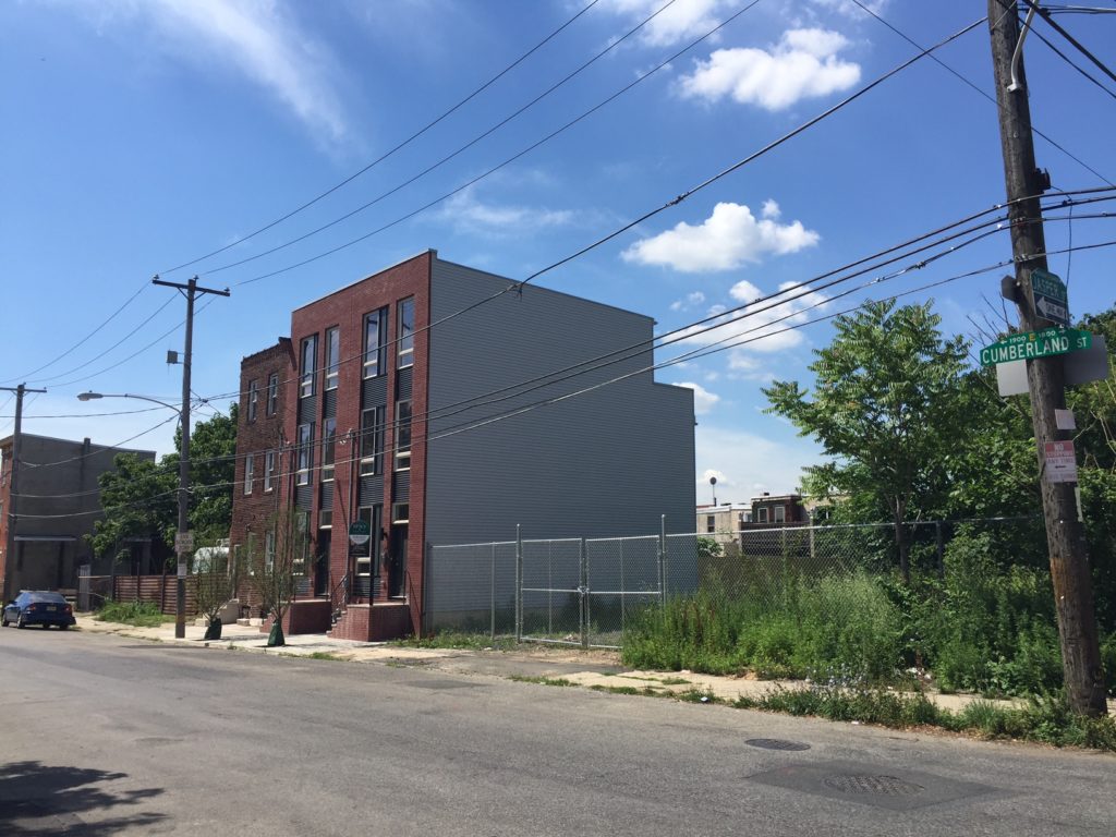 We checked back here in May and discovered the two homes from the previous post were finished, and four new homes had been framed out nearby, with two on Cumberland and two more on Jasper Street. It seems our optimism was warranted, and some new zoning notices nearby further drive home this point. 1840-50 E. Cumberland St. has been an overgrown property with a prominent willow-like tree for many years, but soon enough we could see homes arrive here.