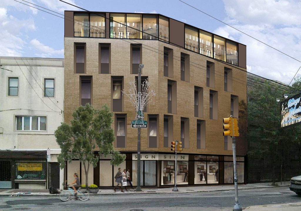 Over the summer, another different developer stepped in. The new developer presented a plan to the East Passyunk Crossing Zoning Committee a couple of months ago for a five-story building with 8 one-bedroom units, 8 two-bedroom units, and ground-floor commercial. We never saw renderings, but word was that the new building would resemble the final rendering from Glass, pictured above. They went to the ZBA last month, but the decision was held. Earlier this week, the ZBA came down with their decision- the application was denied.