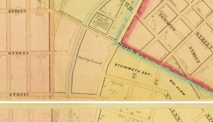 Huge "burying ground" west of Frankford Avenue. Image from Smith & Wistar Map of the City of Philadelphia together with all the surrounding Districts, 1849