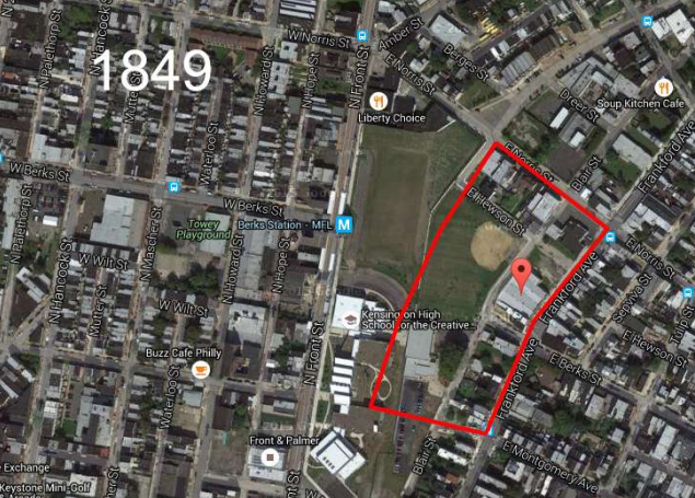 Per the nomination, 1834-48 Frankford Ave. sits on grounds that were at one time part of the Mutual Burial Ground of Kensington. According to a map from 1849, this cemetery was on the west side of Frankford Avenue, extending from Montgomery Avenue all the way to Norris Street. In his nomination, Mr. Milano shows an outline of the historic boundaries of the cemetery and projects them onto the modern streetscape.
