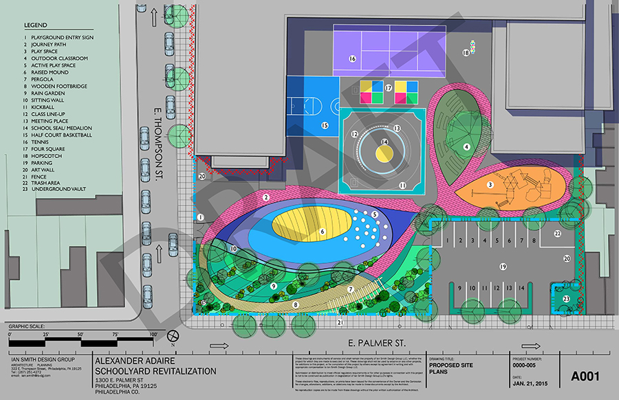 According to the FOA website, the process started back in 2013 with a promise of funding from Council President Darrell Clarke. Over the last several years, there have been countless meetings with neighbors, students, and other stakeholders to determine exactly what to do with the school yard. As is always the case with these projects, PWD has gotten involved, and storm water management will play a major role. Ian Smith Design Group, architects that have worked on many projects we've covered over the years, has taken the lead on the design work, kindly taking on the effort pro bono. They've produced a site plan for the project with details that will look like a fish when seen from above. A rendering shows a fabulous school yard which could soon become a reality.