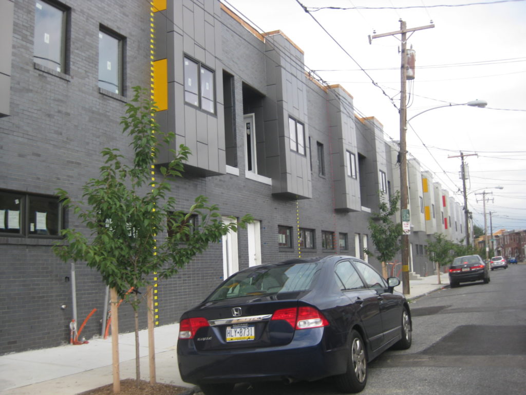 As you can see, the exteriors of the homes on Hagert are pretty much finished, though a closer look indicated that interior work remains for a number of the units. According to the project’s Facebook page, a handful of the properties are under agreement, and one has gone to settlement thus far. The homes offer about 2,500 sqft of living space with 3 bedrooms, 2.5 bathrooms, a huge roof deck, and two-car parking. Most of the homes are listed for around $360K, but we also spied a couple at $390K.