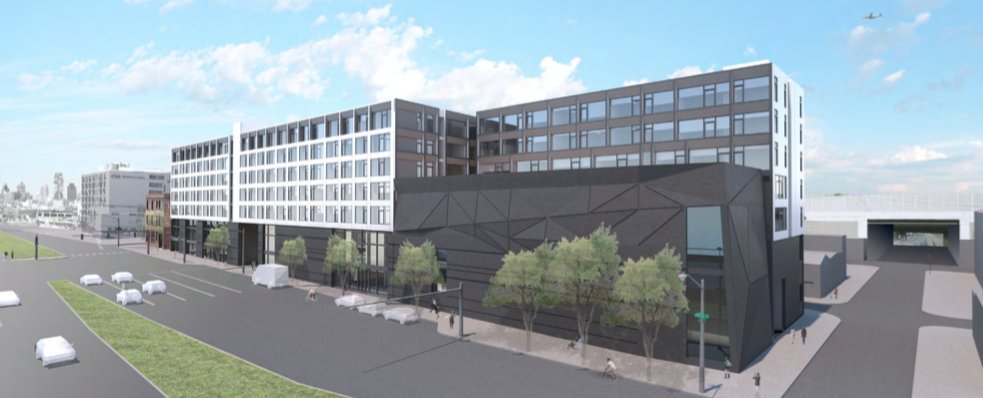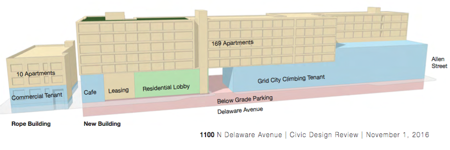 While the pretty pictures give you an idea of what the project will look like, the sectional drawing provides some new and interesting information. Most notable is that Grid City Climbing, a rock climbing establishment, will be the main commercial tenant for the new building in a 23K sqft space. It's a bit of an odd choice for a tenant since Go Vertical is located just around the corner, but with the new addition it seems that Delaware Avenue will officially become the rock gym capital of Philadelphia. So there's that. You can also see that the building will have a much smaller retail space containing a cafe (it won't be an OCF location, we promise), and an 8,000 sqft space in the basement and first floor of the Edward Corner building. You can also see that the project will include an underground parking component, with 75 spaces underground and another 25 at grade.