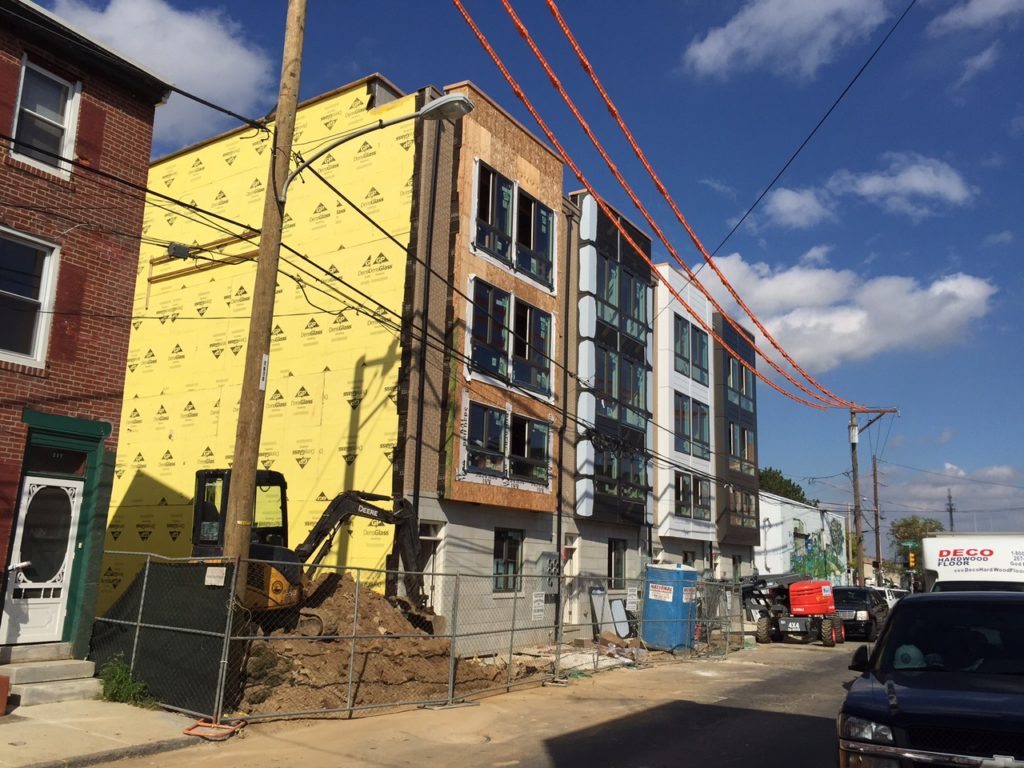 We went to the Fishtown RiverCity Festival over the weekend and traveled to Penn Treaty Park via Columbia Avenue, walking under I-95. For those who haven't made this trek in awhile, it's pretty gross on Columbia Avenue under the highway, though we look forward to the eventual construction of the Columbia Avenue Connector. For now, we would have settled for sidewalks. Anyway, as we were waiting to cross Delaware Avenue, we noticed that four new homes have appeared on the 300 block of E. Allen Street. Compared to what this property looked like in the past, it's a dramatic improvement.