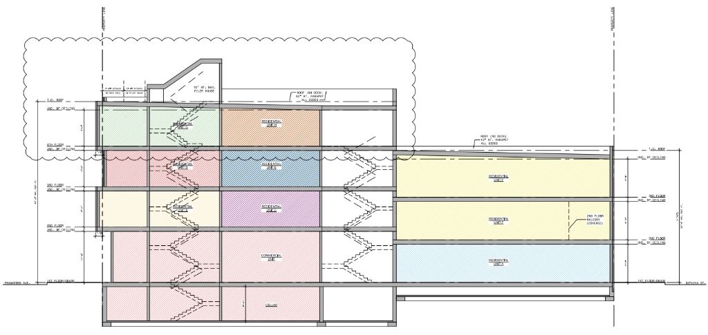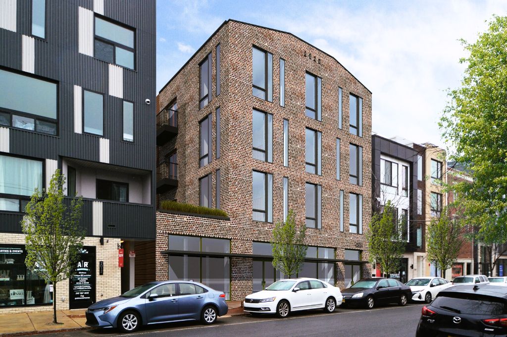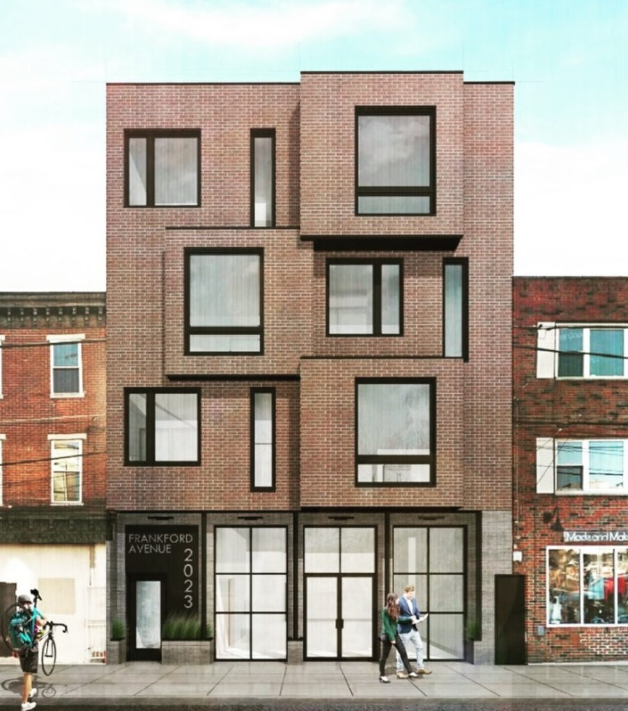 Despite the churn of development along this stretch, this building has remained surprisingly stagnant over these last three years. But fear not, because it sounds like things will get moving here sooner than later. Thanks to an Instagram post from KJO Architecture last week, we now expect that construction should soon begin on the lot. Permits are already in hand for an eight-unit building with Frankford-fronting ground floor commercial space. Check out the elevation drawing along with a rendering of what’s in store for this property.
