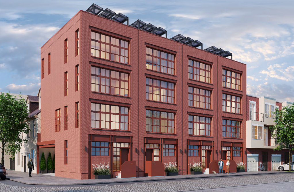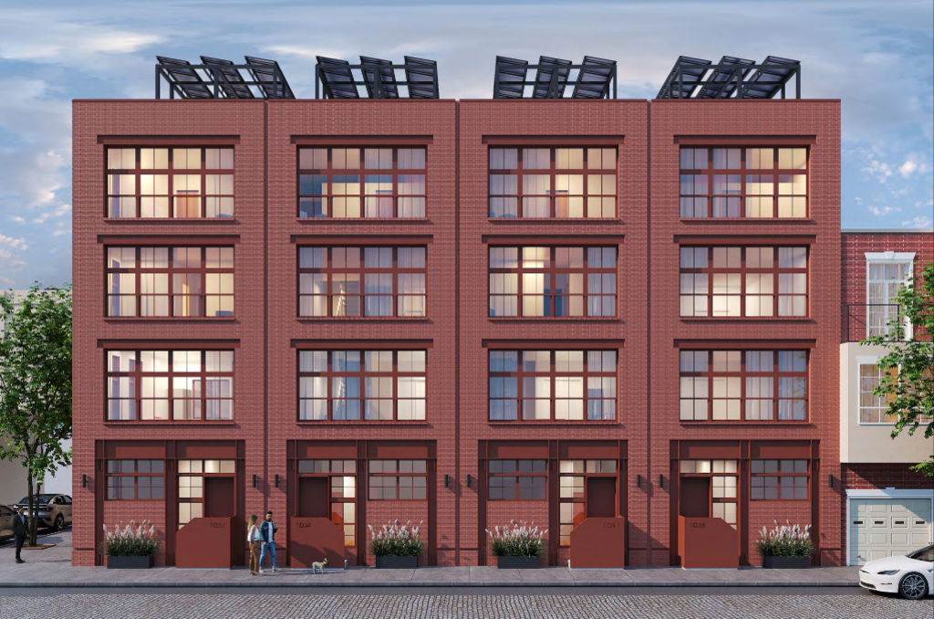 1034 Shackamaxon St., on the far right side of the images above, is a roughly 3,000 sqft corner property that’s home to a two-story home and a small garage. Developers are looking to demolish everything on the site and build four homes along Wildey Street. Though the rooftop solar panels undoubtedly add a contemporary touch, the prominent brick and the large windows reference some of the more industrial buildings nearby, like the former elevator factory across the street, converted into apartments a few years ago.