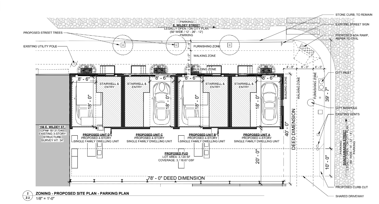 Before this project can move forward, it will need approval from the Zoning Board of Adjustments. As this property is zoned for single family use, the project triggers a host of refusals for density, height, lot coverage, and possibly parking. Speaking of parking, the homes, assuming they’re allowed to move forward, will each have garage parking in the rear, accessed by a drive-aisle off Shackamaxon. This is a common practice for new townhome projects where it can be accommodated, and represents progress from the garage-front homes that were built on Wildey about 20 years ago.