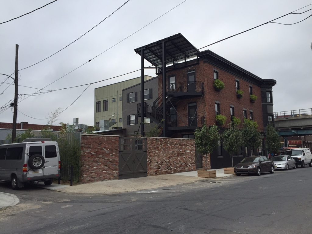 The building had great bones, that's for sure. The cornice was intact. It's a miracle that the cylindrical bay at the corner survived over the years. But when you look at the current view of the building, it looks fantastic. They've painted the bricks on the first floor and created a new cornice above. Planters overflow out of the windows. They took the rear yard, formerly a truck parking area, and converted it into a garden. They took a vacant lot a few doors down on Front Street and built a new building with apartments. And we love the industrial-looking fire escape on the back of the building