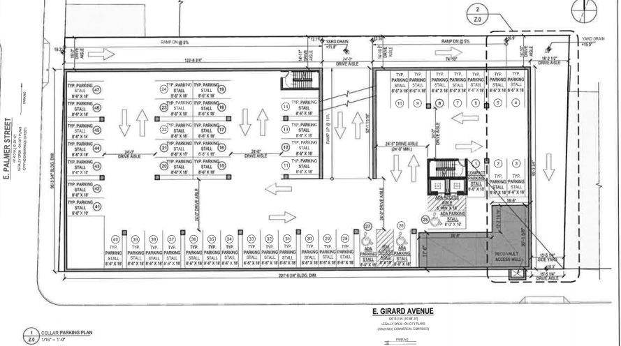 Speaking of the design, the architects at Harman Deutsch were able to come up with a pretty clever approach to accommodate the project specs. To access the underground parking, the building will have a drive aisle along its northern side, accessed from Palmer Street, with an entrance to the parking area in the middle of the rear of the building. Cars will exit the parking lot from the same place, but traffic will flow out of the property along its eastern side, with a curb cut on Girard. As for the apartments on the upper floors, they will be organized in a U-shape, with windows looking out on a section of green roof above the entrance to the parking garage. The building itself will be on the utilitarian side, but will certainly be an upgrade over the status quo. It’s also possible that after the community meeting and CDR, we’ll see changes to some of the design elements.