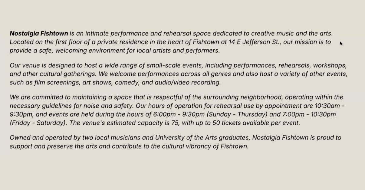 After a brief conversation about the possible impact the venue’s visitors could have on the surrounding blocks, the RCO voted voted overwhelmingly in support of the special exception. Regrettably, the high volume of projects that need the approval of the zoning board means this case won’t get heard by the ZBA until late July at the earliest. Just like how you can’t hurry love, there’s not much small businesses can do to speed up the City’s drawn out zoning process. Hopefully by the fall, Nostalgia Fishtown will be up and running, hosting 4 or 5 shows a week.