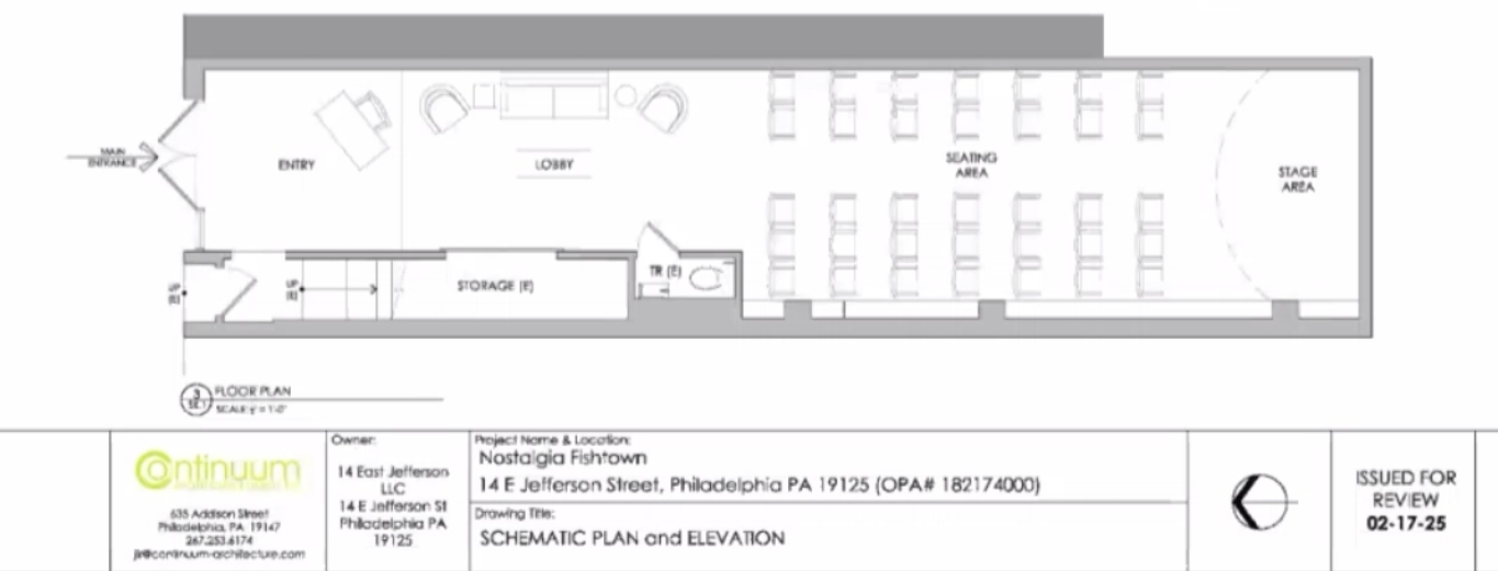 The owners seem to have largely addressed the concerns of neighbors by agreeing to requests to limit the venue’s hours. While capacity may technically reach 75, the anticipated typical attendance of 20 or so should represent a fairly limited disturbance on the neighborhood. With bigger venues nearby like Johnny Brenda’s or Kung Fu Necktie geared for larger shows, the typical performance at Nostalgia Fishtown will be closer to NPR’s Tiny Desk concerts. As we can see from the plans from Continuum Architecture & Design the stage will be deep in the back of the building, which should also help with containing noise.