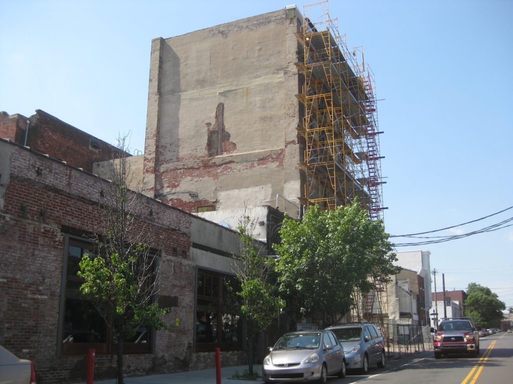 The L&I Map only indicates permits for masonry work to replace loose and missing bricks. The permits specifically state that sealed windows are to remain undisturbed. So while it's possible that the scaffolding you see in the photo portends the building's restoration, there's also a chance that the property owners are simply performing long overdue maintenance and the redevelopment is still a ways away. The same can't be said for a garage a few doors down at 1236 Frankford Ave., which is no more.