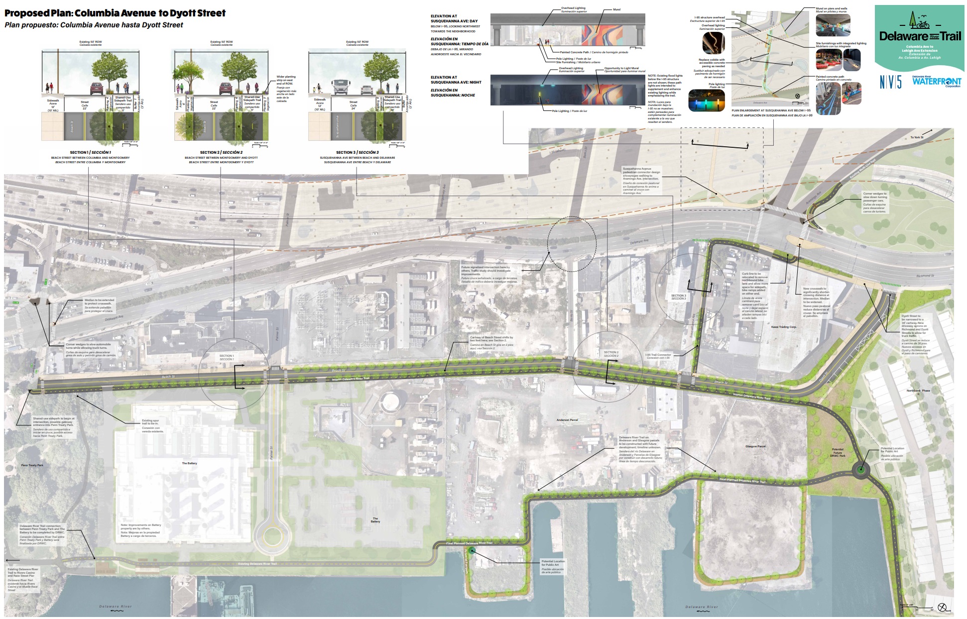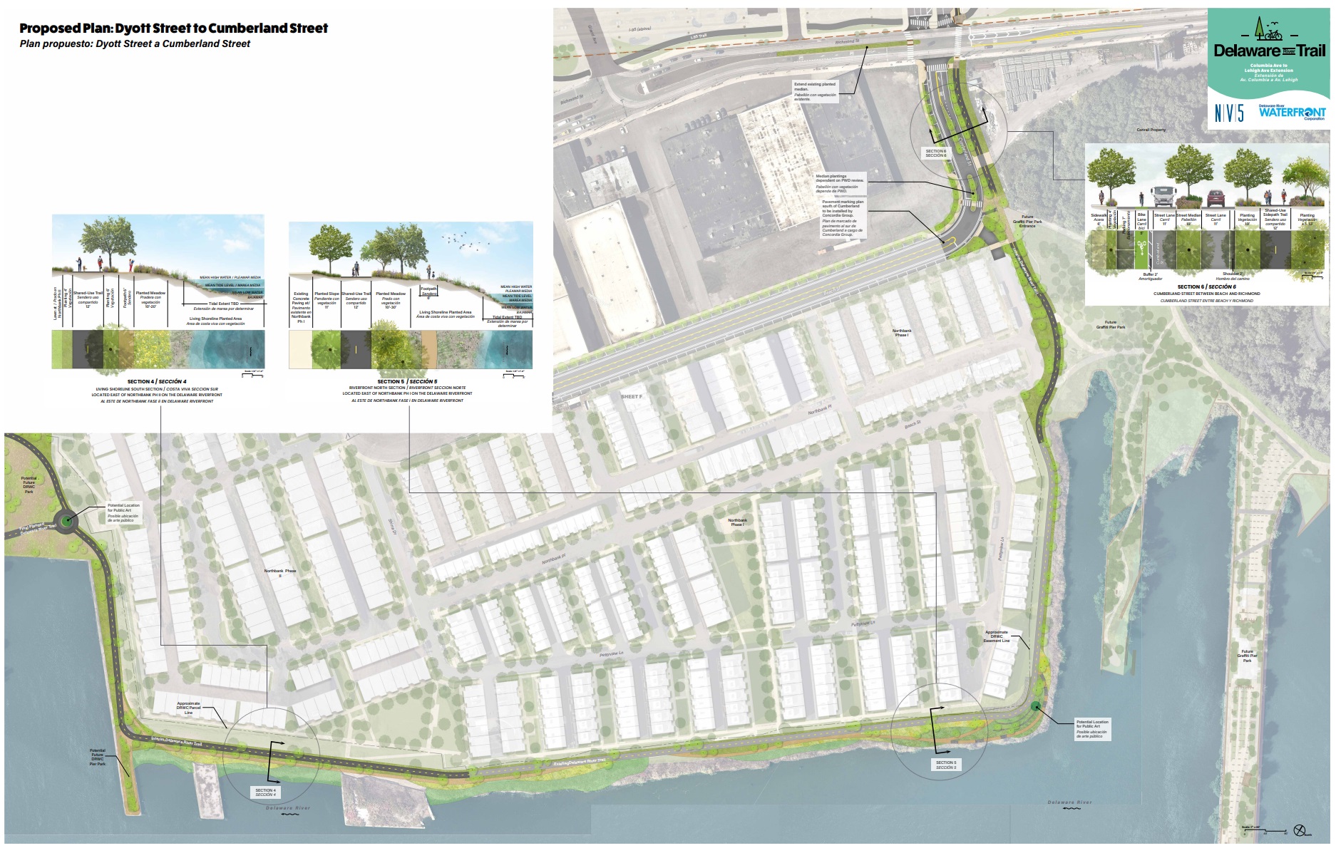 In just the few years of its existence, the Delaware River Trail has changed the city’s eastern waterfront wildly, with its 3+ mile stretch in the heart of town creating a place for all types of activity. However, the southern terminus around Pier 68 and the northern terminus at Penn Treaty Park are less welcoming than the central portion of the trail. Luckily for us, the plans for the northern end should change that soon enough.
