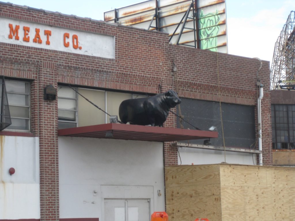 We wondered, could this be the beginning of a big adaptive use project? Could this old warehouse be turning into apartments? An entertainment complex? Turns out they're just doing a little repair work on the building. So nothing is happening here that will impact your life any time soon. But they do have a sweet cow mascot!