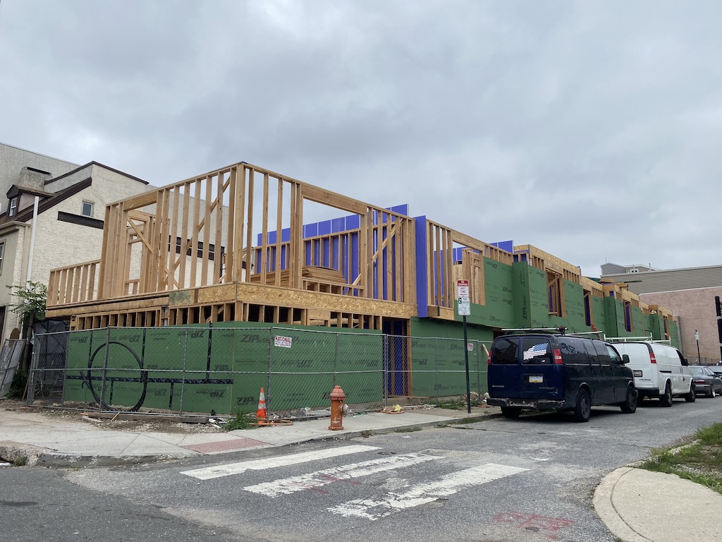 Things look rather different if you visit this property today, as the old building is gone, the trees and bushes are out, and eight homes are under construction. Red Oak Development is building the project and has named it Riverside Row. Clearly, the community had an easier time with this new version of the project thanks to the reduction in density and the fact that every home in the project has parking, accessed from a drive-aisle.