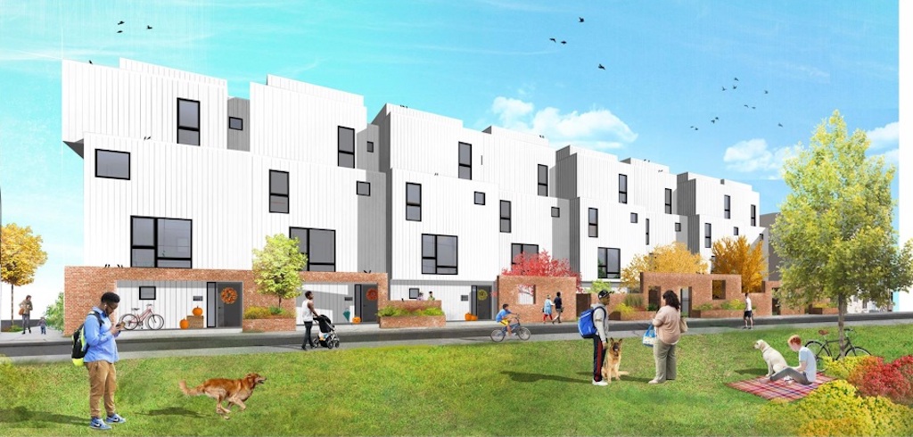 Bright Common did the contemporary design work for this project, and on their website they explain some of the unique elements of the homes. For example, the rear drive-aisle eliminated rear yards, so these homes instead have front courtyards of varying sizes. They also note that the exterior cladding won’y have many seams, and suggest that the homes will look like stacked blocks when they’re done. Their rendering certainly suggests as much.