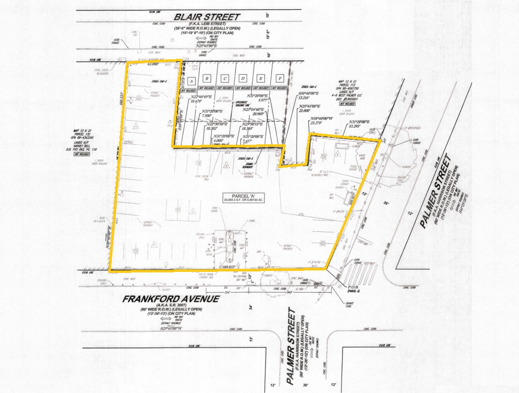 An outline of the lot shows how building will mostly front Frankford Ave. and Palmer St.