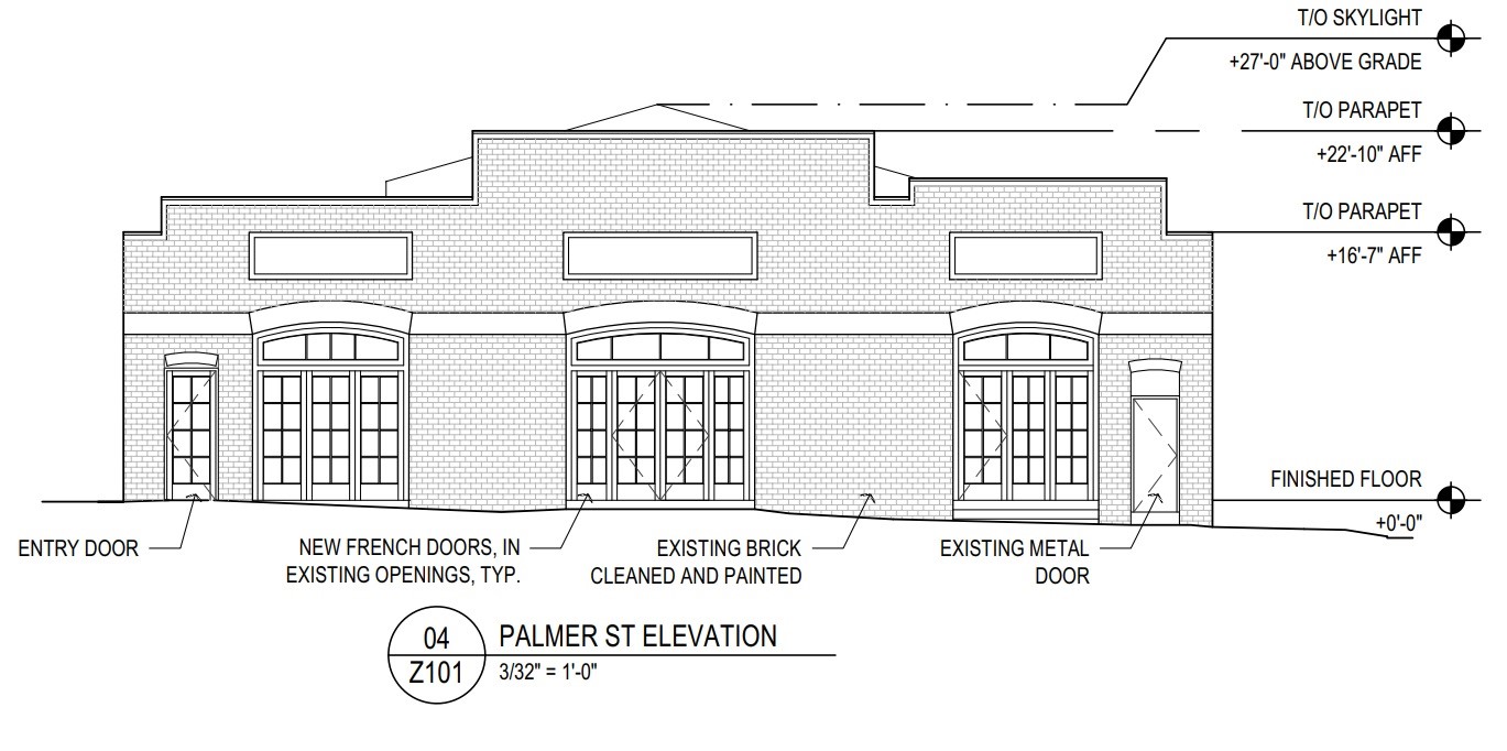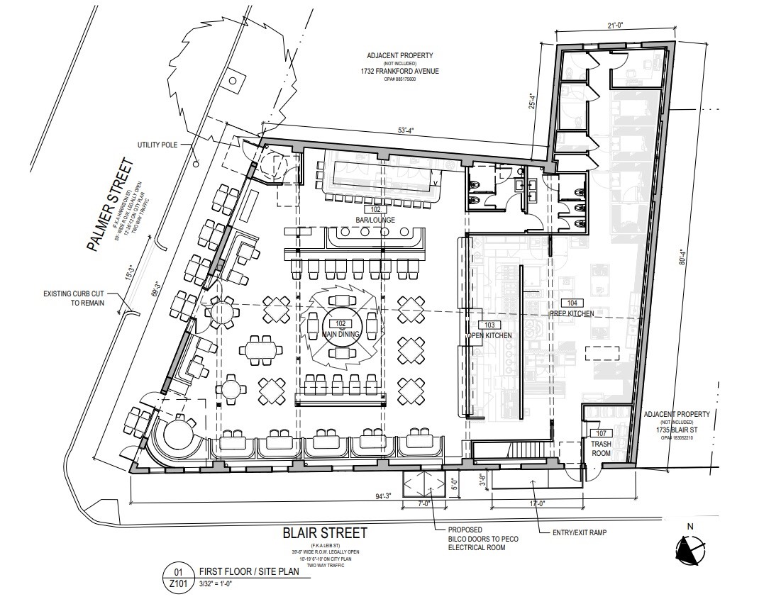 Site plan shows plenty of seating, including bar space and outdoor seating along Palmer