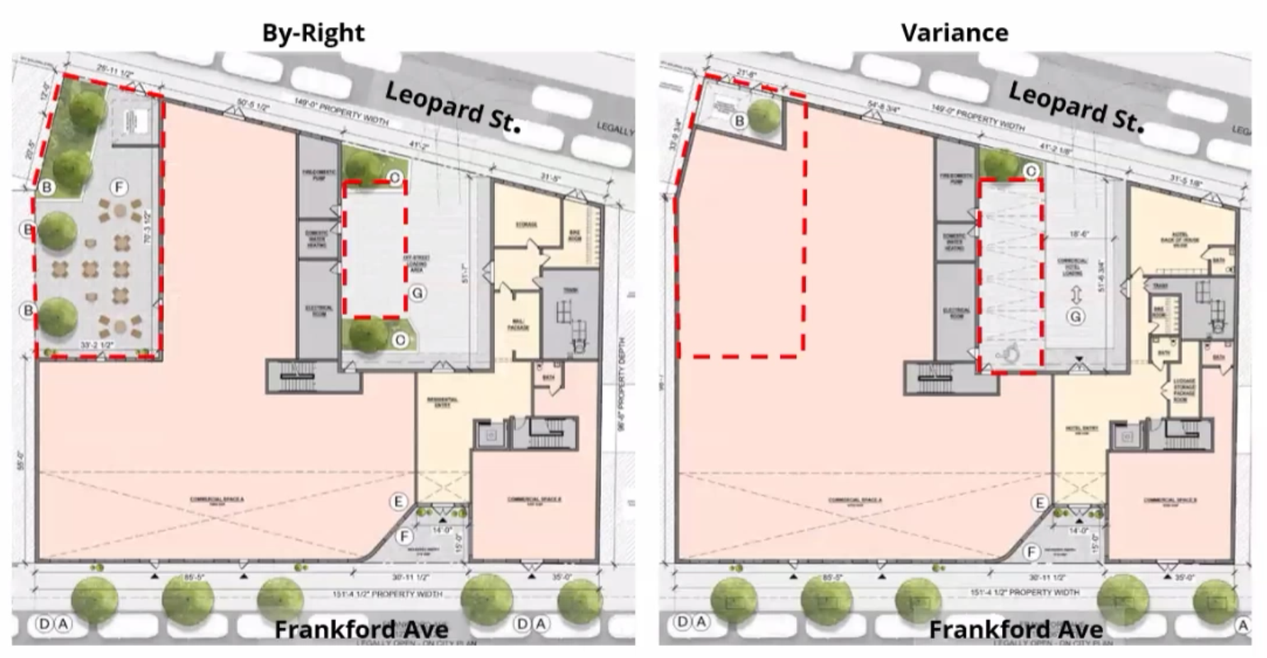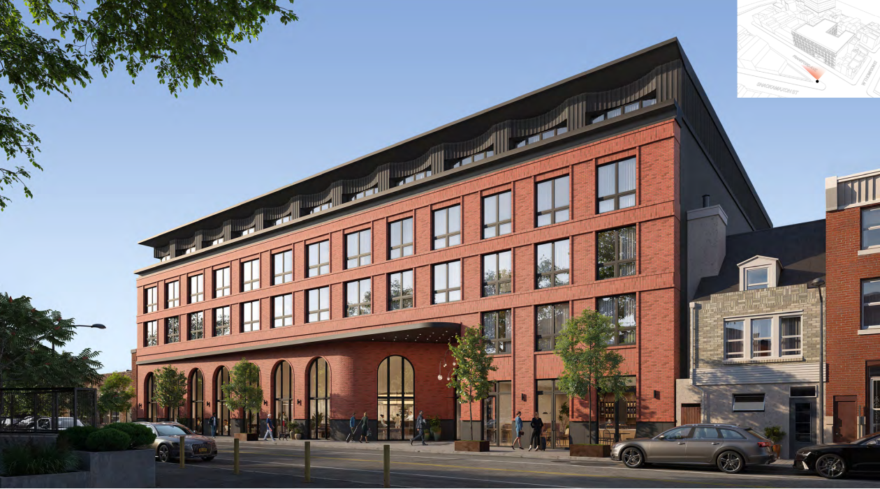 The two proposals would be located within an almost identical footprint with nearly the same architectural features, with the residential plan including a courtyard in the rear and no parking and the hotel version replacing the courtyard with additional commercial space and adding 5 parking spots. We can see from the plans from Gnome Architects, the building’s gorgeous brick facade and primary entranceway will join the commercial corridor along Frankford Avenue, with the building having a reduced presence in the rear along the more residential Leopard Street. The top floor will use wood cladding with a scalloped profile that will add a bit of a contemporary touch to the building.