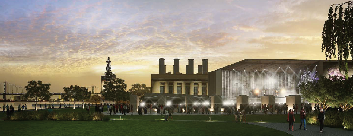 Construction has been on-going for some time, with a two-story addition recently joining the freshly painted chimney stacks on the roof of the building. This first phase will see 239 apartments and 49K sqft of office space in the Boiler House, with an additional 45 units and 25K sqft of event space (brought to you by Cescaphe) in the Switchgear Building. The developers are also working to bring the Louis Kahn-designed floating stage, Point Counterpoint II, back to the architect’s hometown as an additional amenity to hold concerts and public events. Check out the current status and some of the exterior renderings for what they have planned for the site below.