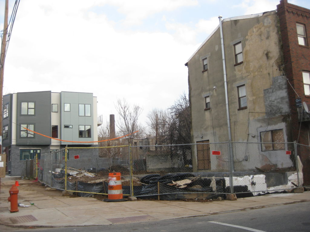 Less than two months ago, we wondered about a poured foundation and a Cease and Desist notice hanging at the corner of Dauphin & Amber. Checking back in on this East Kensington corner, we discovered two new homes, including one we weren’t expecting to find.