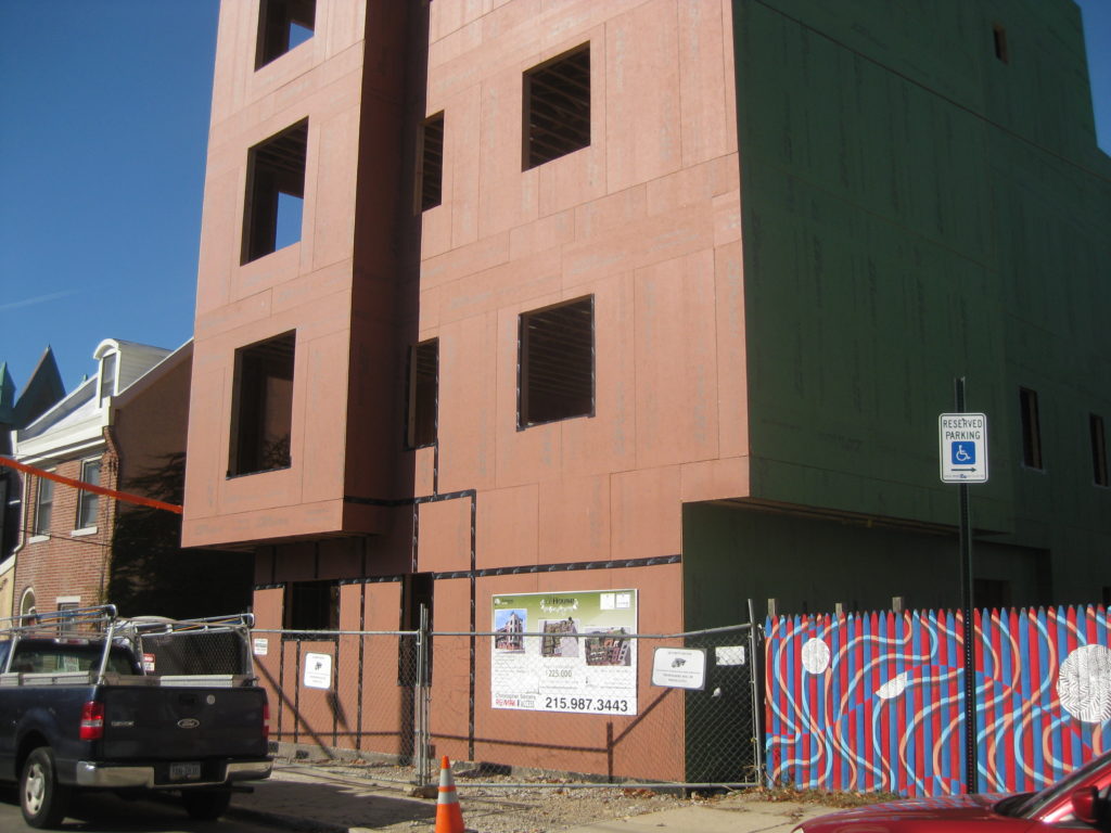 It's been awhile since we last visited the IceHouse project in Fishtown, at the corner of Columbia & Thompson. Last time, we had learned that the second phase of the project was about to get underway but were surprised to learn that this would involve the construction of a condo building behind the already existing structure and not on the vacant corner lot in front of it. The new building fronts Moyer Street, and has replaced a vacant lot.