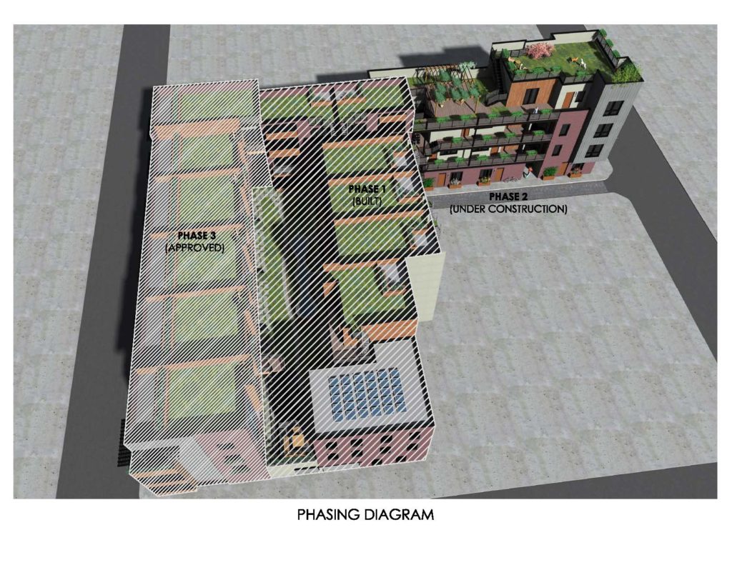 Joining the already-existing thirteen condo units built during the first phase of the project will soon be nine additional condos. Parking for these units will be in the same garage used by the folks who bought the first round of condos. Also, there will be a shared green roof space on the top of this building, with a cooking area and a dog park of sorts.