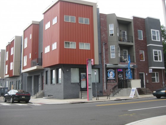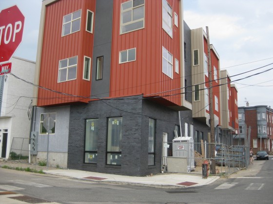 Over the winter, we told you about two new foundations right off the corner of Frankford & Montgomery, next door to a building that went up in 2011. These square-shaped homes were being built on the rear of a huge Frankford Ave. lot that was being chopped up into three lots. We were in the area the other day, and noticed that the homes are nearly be complete.