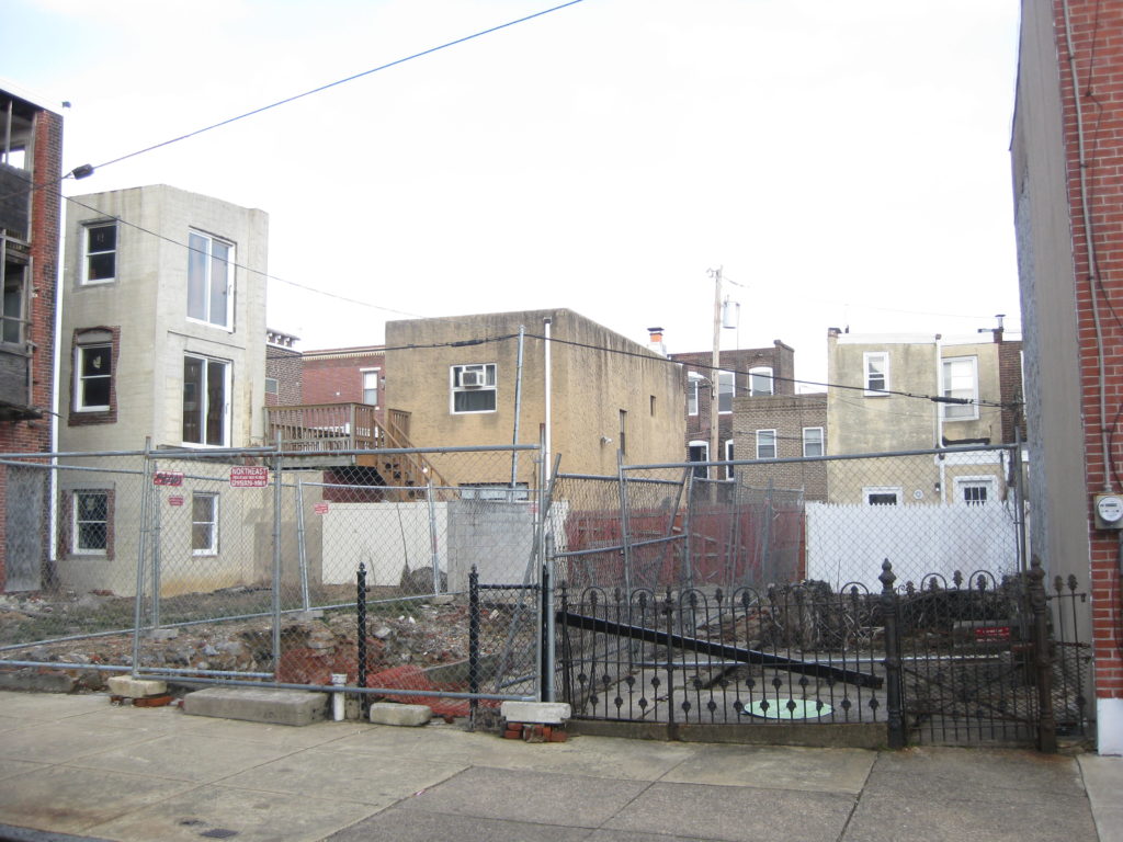 The lot on the right, 1129 E. Montgomery Ave., was once a teeny little cottage, set back from the street like many other Fishtown homes. It featured an odd triangular roofline and some sweet vinyl siding. As far back as 1998, it was in need of some TLC, and sometime between 2003 and 2009 it was torn down. Currently, it’s listed for sale at a too-high price of $125K, especially considering it’s less than 14′ wide.