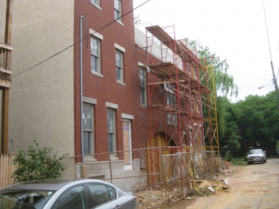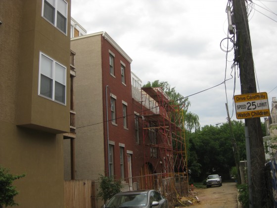 When we last checked in on the 800 block of Opal Street in January, two new homes separated by a garage had just been framed out. In case you’ve forgotten, these homes were designed by David Traub Architects and were inspired by the Schmidt’s carriage house a couple of blocks away on Cambridge Street. A reader checked in recently and suggested we come back to Opal Street to check on the progress of the homes.