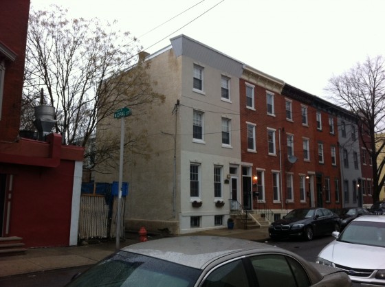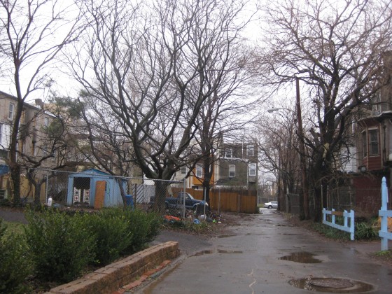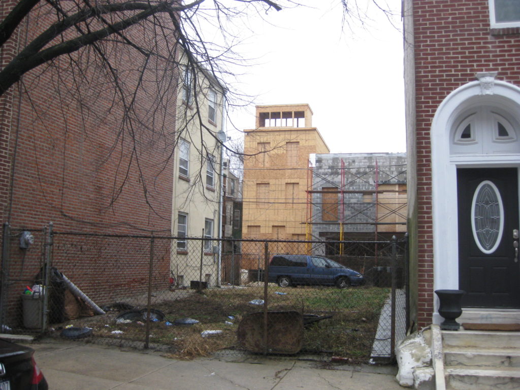 An unusual aspect of this block that we’ve failed to mention thus far is that it narrows considerably at its southern end. A home on Parrish appears to have been built into Opal Street at some point, ostensibly infringing on the public right of way. As you can see below, it’s very tough to fit a car down the last 50′ or so of the block. Hidden City referenced this situation while doing a story on the Streets Department’s insistence that 20th Street residents are in violation of the City’s plan for Opal Street.