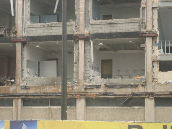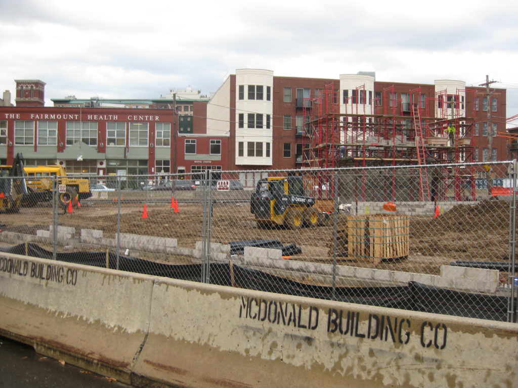 The project officially broke ground last month, and we recently noticed some walls (or perhaps elevator shafts?) rising from the ground.