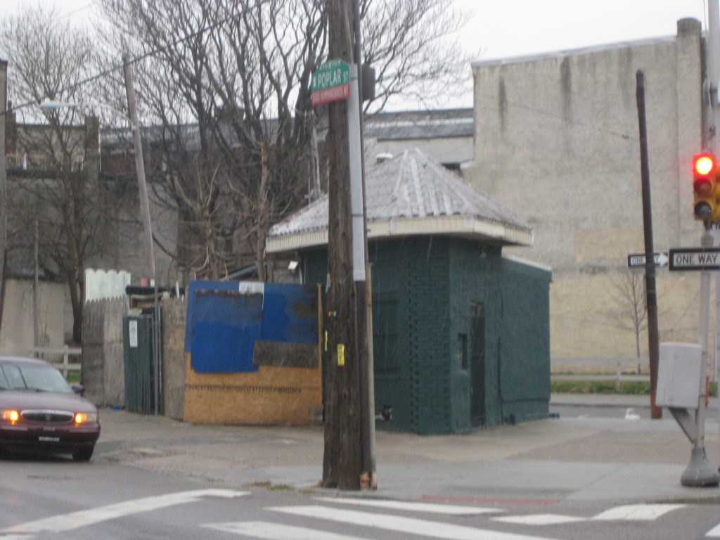 The lot upon which this building sits is created by the tight intersection of Poplar Street with diagonal Ridge Avenue and Vineyard Street. The little lot has a rough looking one-story green structure that looks like it could blow over from the force of a minor breeze. Along with the little green building, there’s a fenced-in area that’s a real eyesore. Public record says that the parcel is over 1,300 sqft, but we’d guess it’s maybe half that size.