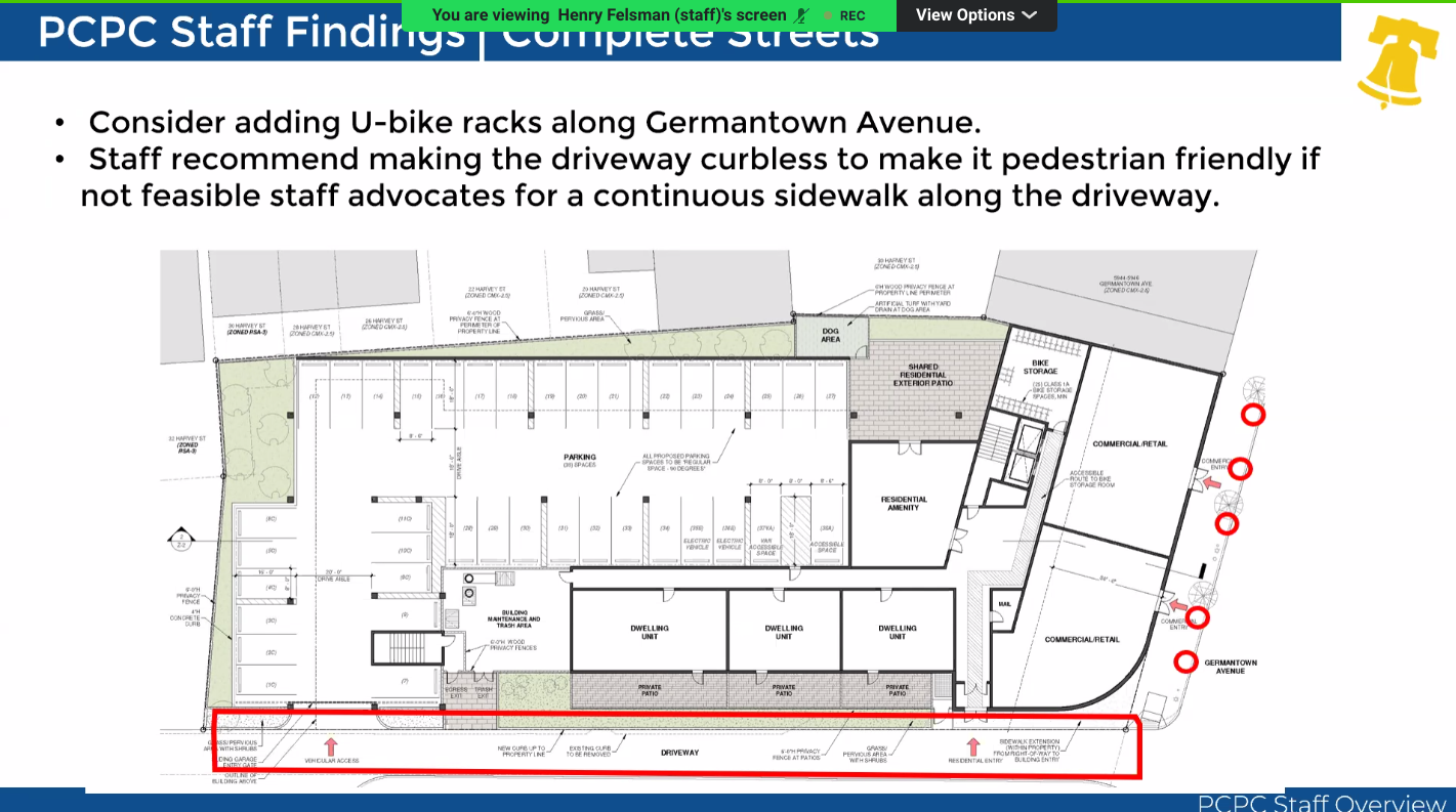 Eliza Bower of the Philadelphia City Planning Commission reminded the committee members that because the development site is within the Germantown Neighborbood Commercial Area Overlay District, the project will go through an additional facade review process. While remarking that the PCPC staff appreciated the use of high quality materials along Germantown Avenue, staff did request that the developer utilize brick for the entirety of the building to create a more cohesive design.