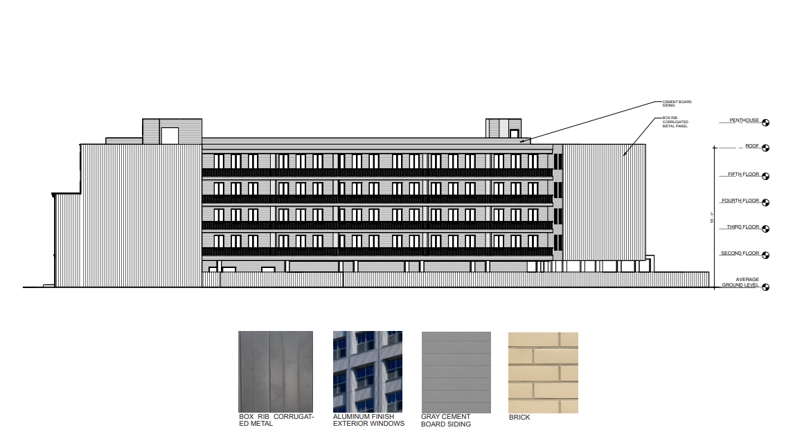 The first three floors of the facade on Germantown will be brick, with corrugated metal siding on the 4th and 5th floors. Architects from Canno Design noted the top floors of the building are set back after the 3rd story to match other buildings on Germantown Avenue. The use of beige brick and the rounded curve of the southern portion of the facade was also an intentional nod the the adjacent Town Hall Building. Canno noted that the building will be particularly visible because of the way that the long vacant Germantown Town Hall is set back from the Avenue.