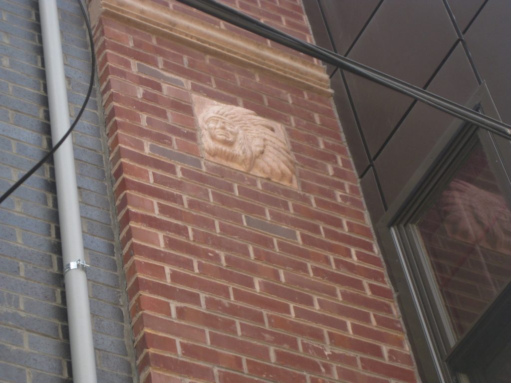 The facades have changed little in over two years, though some sheathing has appeared on the bay windows. The western bay looks like it got damaged, perhaps by a passing truck. Somehow, when we last visited these homes two years ago, we didn't notice the unusual details present on their facades. On either side of the front doors and immediately above the garages, you can see (clearly prefabbed) carved faces in the stone. Above, there's some additional carvings in the brick.