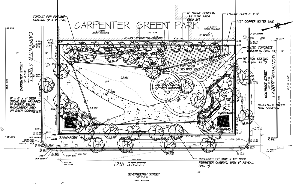 Most of the parks in this town have been around for quite some time. Rittenhouse Square dates back to the age of William Penn's greene country towne. Capitolo Playground, across from Pat's and Geno's, is a much newer green space and still dates back to the 1950s. So it's rare that we get to see a park born in Philadelphia but that's exactly what's happening right now on the northwest corner of 17th & Carpenter. We first told you about plans for Carpenter Green over two years ago when it was far from a sure thing, but if you visit the site today you can see that it is most assuredly happening.