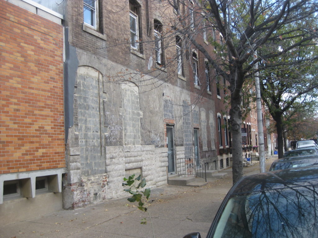 These properties must have been amazing once upon a time. You can see where the old doors and windows on the first floor have been sealed, and there are some busted up remains of brownstone details on two of the buildings. You can also see the original window openings, calling for much larger windows than we see today.