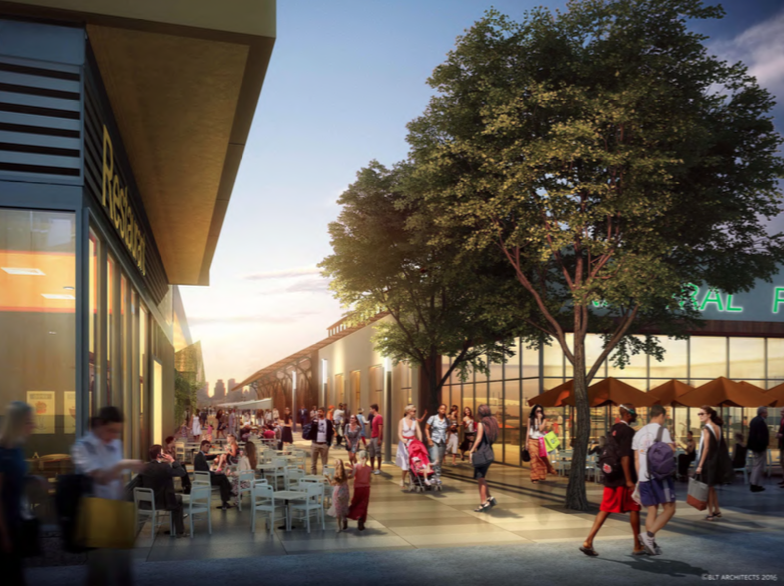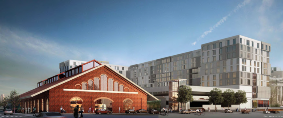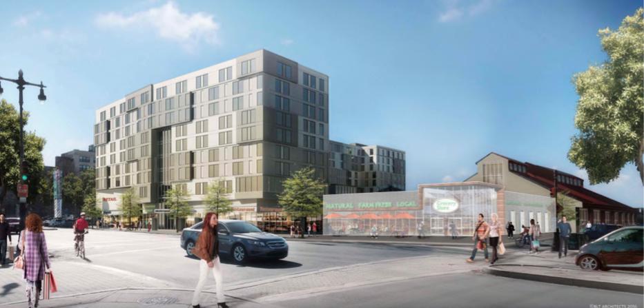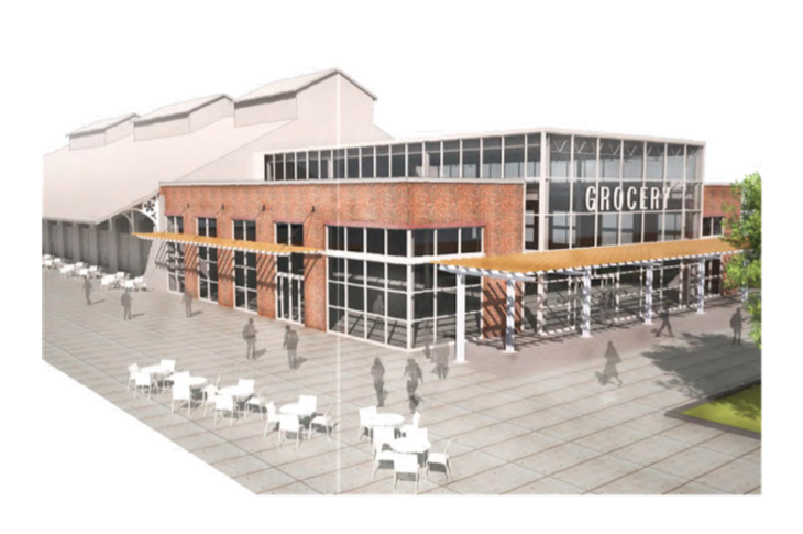As we said, the historic train shed will be used for part of a grocery store. The rest of the store will be located in a new building that will go up in front of the old structure. Architecturally, we appreciate that the developers aren't going to try to make the new building blend in with the old building. The flat roof and use of glass will create a contemporary vibe and will also allow for a more welcoming entrance for customers.