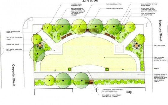 In ode to Abele’s achievements, the park will have an entrance gate inspired by the Duke University Chapel Tower. It will consist of mostly lawn space in the middle (holds 150 people) surrounded by pavement and encompassed by a canopy of trees. Everything, including the grass area and benches, will be facing a performance space on the opposite side of 22nd Street, which has its back to nearby buildings. The intended plan has enormous potential and could serve to really transform this block into something both useful and attractive, whereas at the moment it sits looking mostly like an empty lot. With a $150K grant in hand, the Parks and Recreation is set to begin construction this fall. —-Alex Graziano