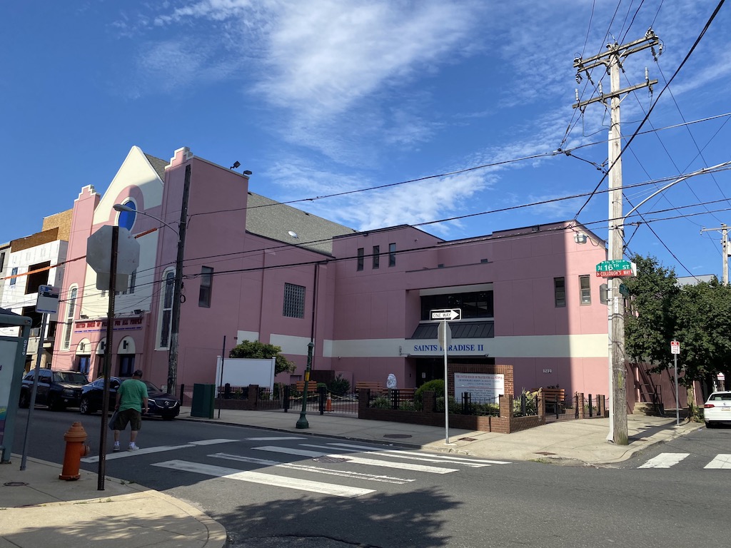 While we’re here, we might as well point out one of our favorite churches in Philadelphia, the United House of Prayer for All People. While Philadelphia has its share of dramatic and impressive churches that date back a hundred years or more, this building is much newer and quite unique for Philadelphia. With its stucco-clad exterior and a palette mixing pink and off-white, it looks like it would fit in better in Miami than on a corner in Philadelphia. With the weather being as hot and humid as it’s been, and a tropical storm on its way, all we need are some palm trees to truly complete the picture.